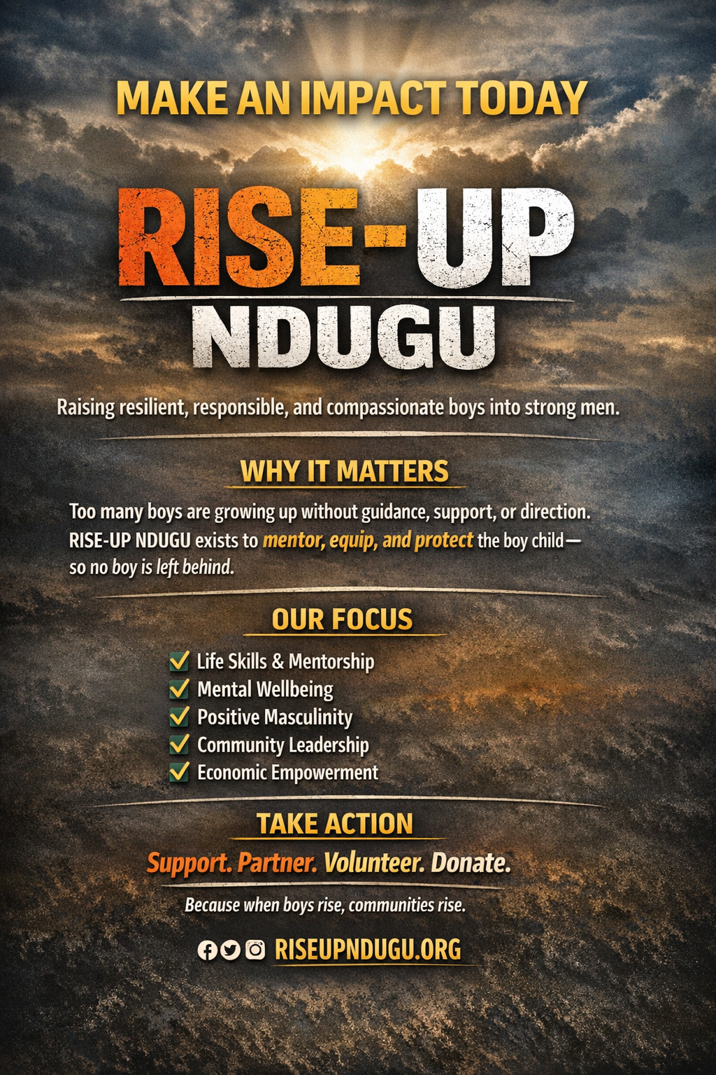 RISE-UP NDUGU Initiative Uganda empowers boys and young men to rise with confidence, dignity, and purpose. Through targeted policy advocacy, economic empowerment programs, and inclusive gender-equality initiatives, we equip young men with life skills, leadership values, and opportunities to become responsible leaders and nation builders. Working hand-in-hand with communities, schools, and partners, we foster safe, supportive environments that promote positive masculinity, reduce violence, and expand economic prospects for a lasting social impact across Uganda.No matter where you are in the world, you can be a part of the RISE-UP NDUGU journey.